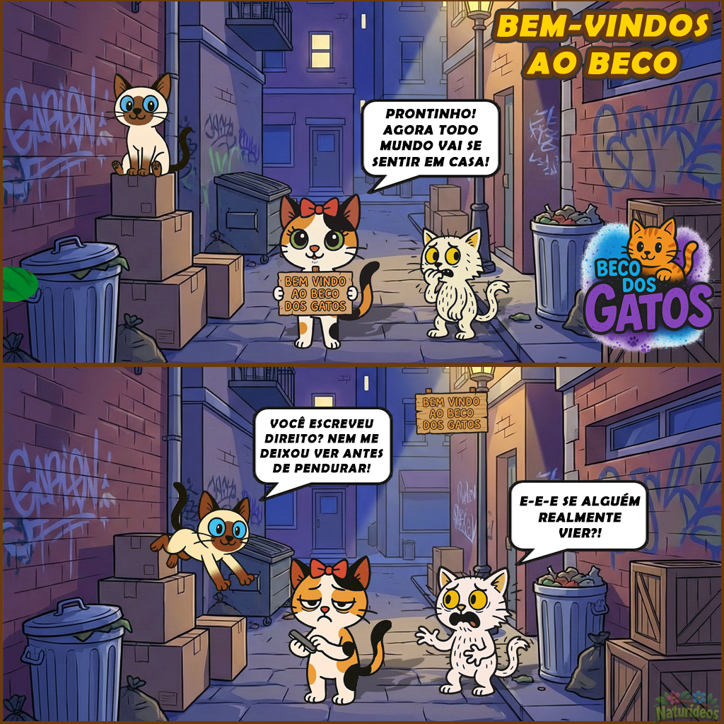 “Bem-vindo ao Beco dos Gatos — COM EMOÇÃO.”