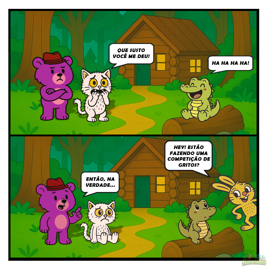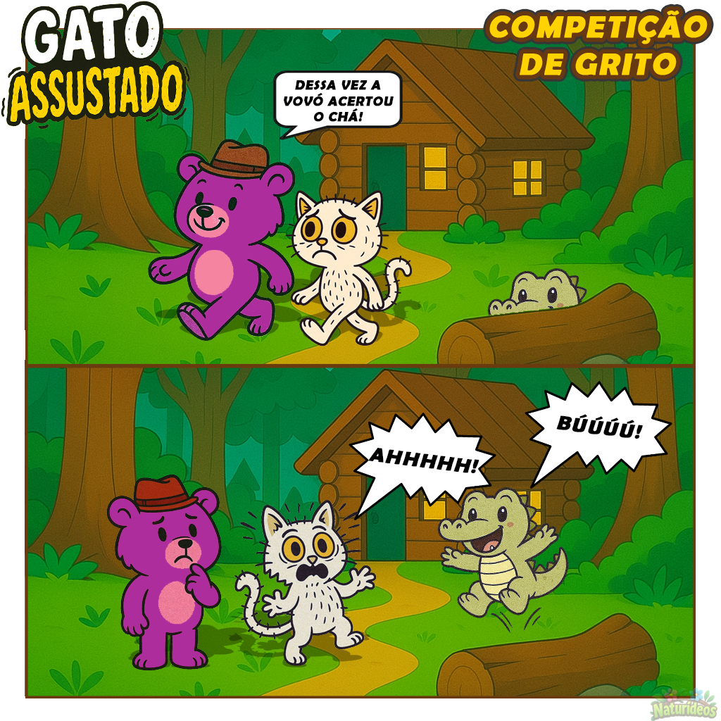 Na tirinha de hoje, o Gato Assustado leva mais um daqueles sustos que só ele sabe sentir — cortesia do Jacaré Bebê, que achou que estava apenas brincando.