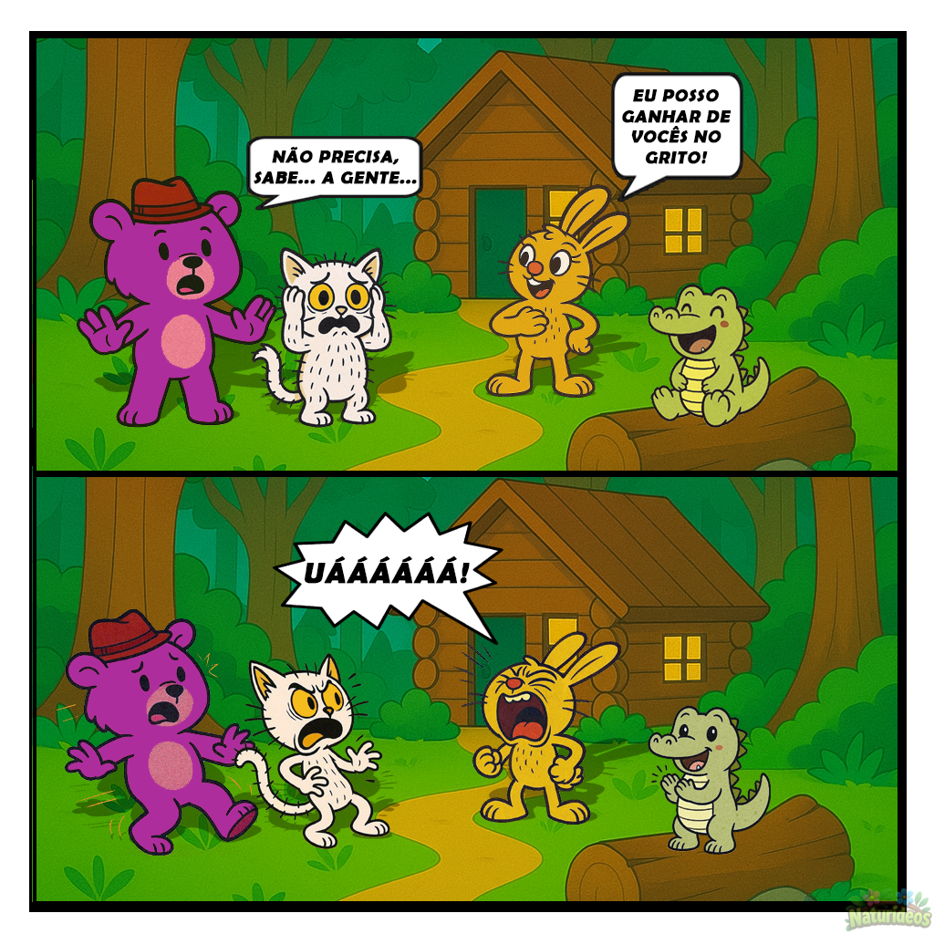 Mas o caos realmente começa quando a Coelha Amarela aparece e interpreta tudo como uma competição de gritos. Sem esperar explicação, ela decide participar e mostra que, quando se trata de gritar, ninguém vence dela!