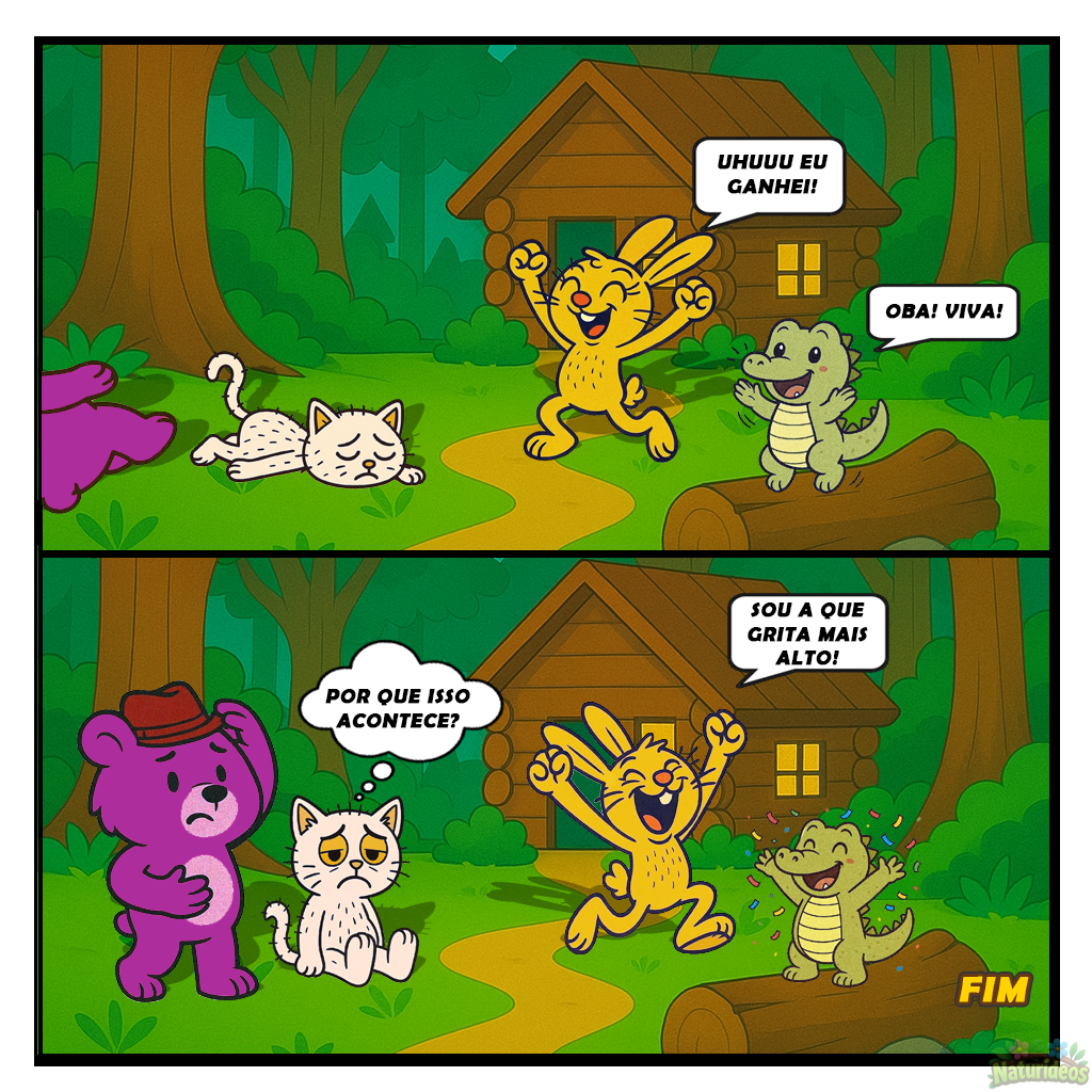 Gato no chão, Jacaré vibrando como se fosse um campeonato de verdade e o Urso Roxo tentando entender como essas situações sempre acontecem.